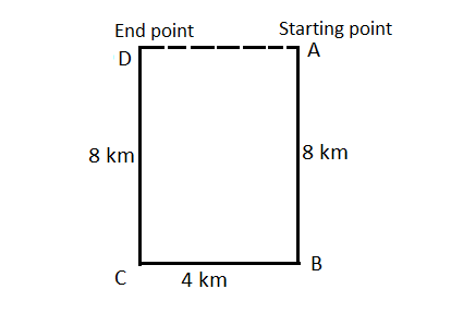 Radha travels 8 km to the South then she turns to the right and walks 4 km. Then again the turns to her right and moves 8 km forward. How many km away is she from the starting point?