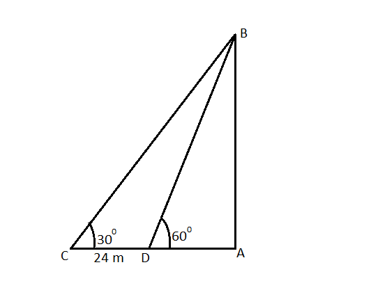 The angle of elevation of the top of a tower at a point on the ground is 30 degree. On walking 24 m towards the tower, the angle of elevation becomes 60 degree. Find the height of the tower.